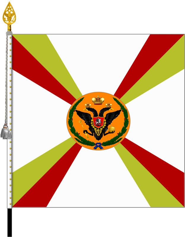 При его формировании в 1811 г. батальонам полка переданы знамена, образца 1800 года, по одному от Ревельского Гарнизонного полка (черный крест и красные углы), Нарвского Гарнизонного батальона (крест малиновый с белым и белые углы) и Перновского Гарнизонного батальона (черный крест и красные углы). Подскажите, какого образца было шефское (белое) знамя данного полка и каков был цвет древка данного знамени? Я предположил, что данное знамя могло быть образца 1803 г. (белый крест и белые углы), а древки его могли быть жёлтыми (4-й полк в 14-й дивизии). |